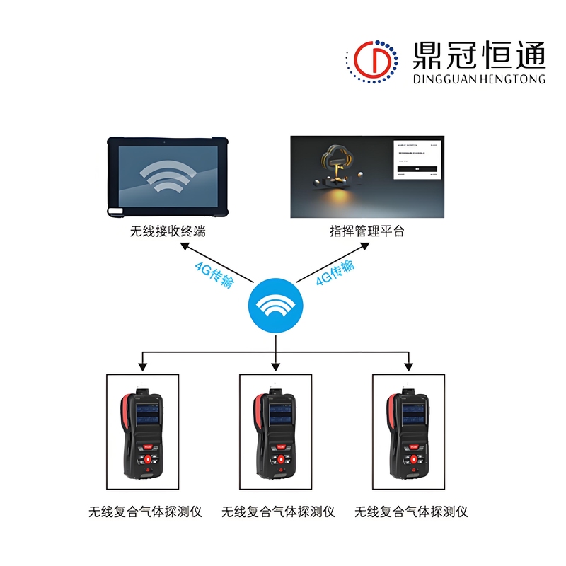 DG-F1600s型無線復合氣體探測儀,具備泵吸采樣方式,可檢測6種有毒有害氣體;具備4G無線傳輸功能,可將檢測氣體數(shù)據(jù)實時傳輸?shù)胶蠖酥笓]平臺,傳輸距離不受距離限制,實現(xiàn)同步報警功能。